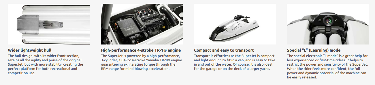 With its pumping three-cylinder, four-stroke engine, the sleek and ultra-light SuperJet delivers a powerful combination of blistering acceleration in the highspeed straights, while its agility, manoeuvrability and control will let you carve corners like never before.
